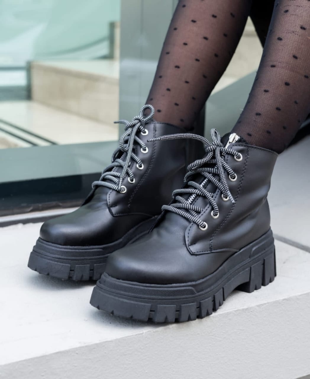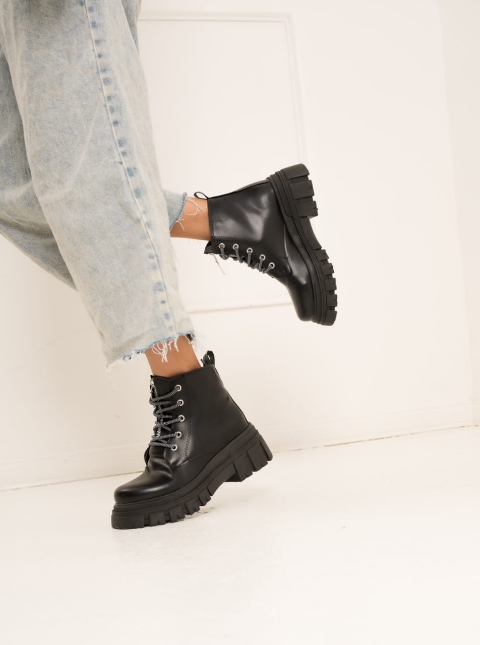 Elaboradas en ecocuero de calidad superior, estas botas de estilo militar resaltan por su diseño actual y audaz, con cordones robustos, ojales metálicos plateados y una suela track imponente que te proporciona altura y presencia. Los detalles de tachuelas plateadas en la parte superior aportan un toque rockero y distintivo.