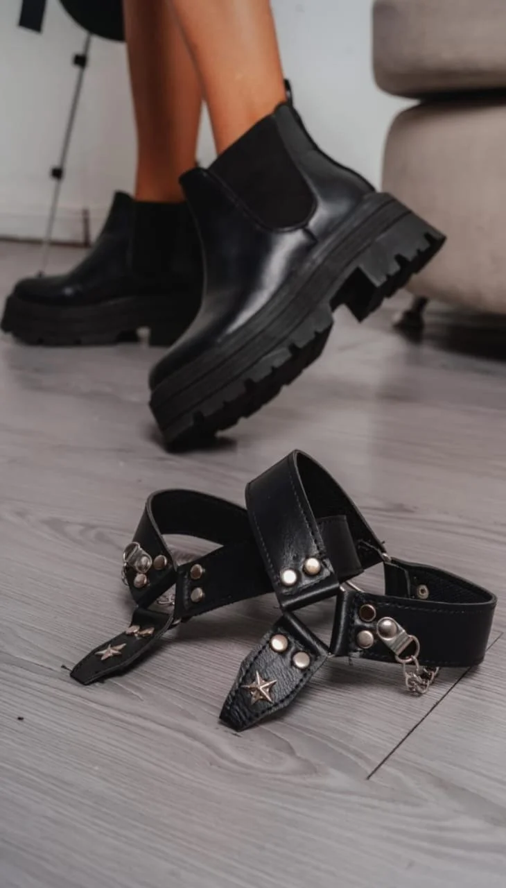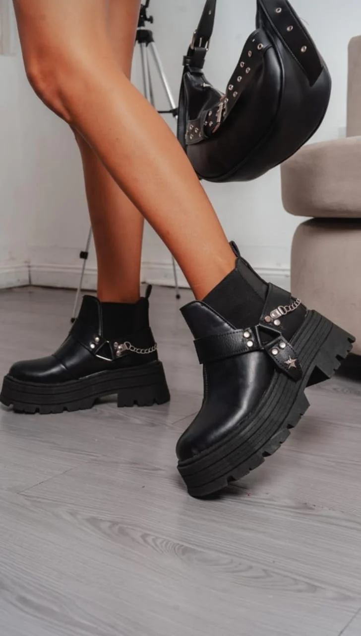 Estas botas son puro power. Tienen esa vibra rockera que te da confianza apenas te las calzás, con detalles metálicos que gritan actitud sin perder el estilo. La suela Gruesa te sube unos centímetros y te plantan firme, antes cualquier evento. Son de esas botas que se roban todas las miradas, perfectas para armar un look con personalidad y salir a romperla cuando y donde quieras.