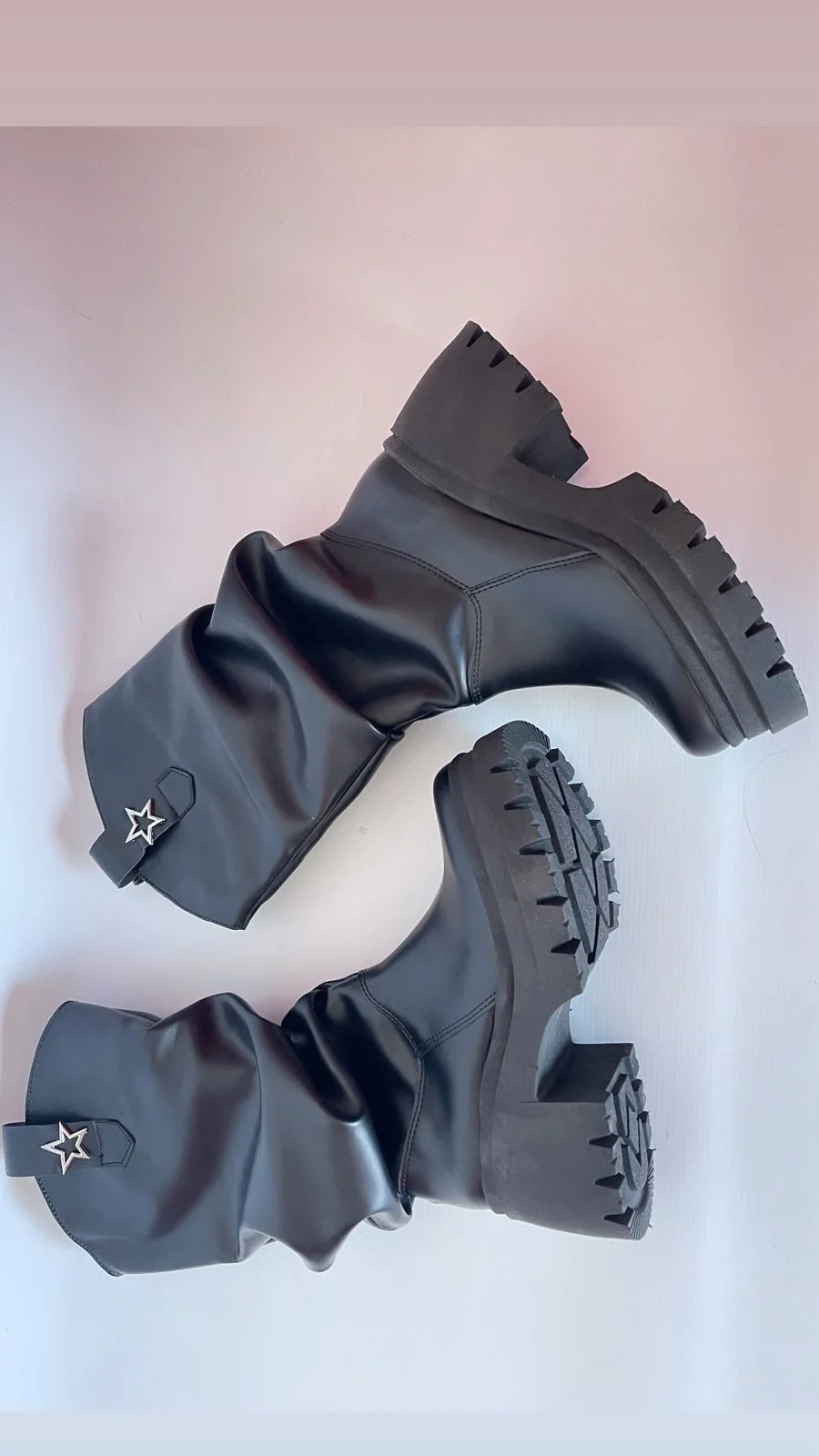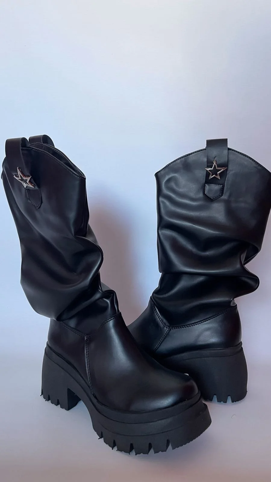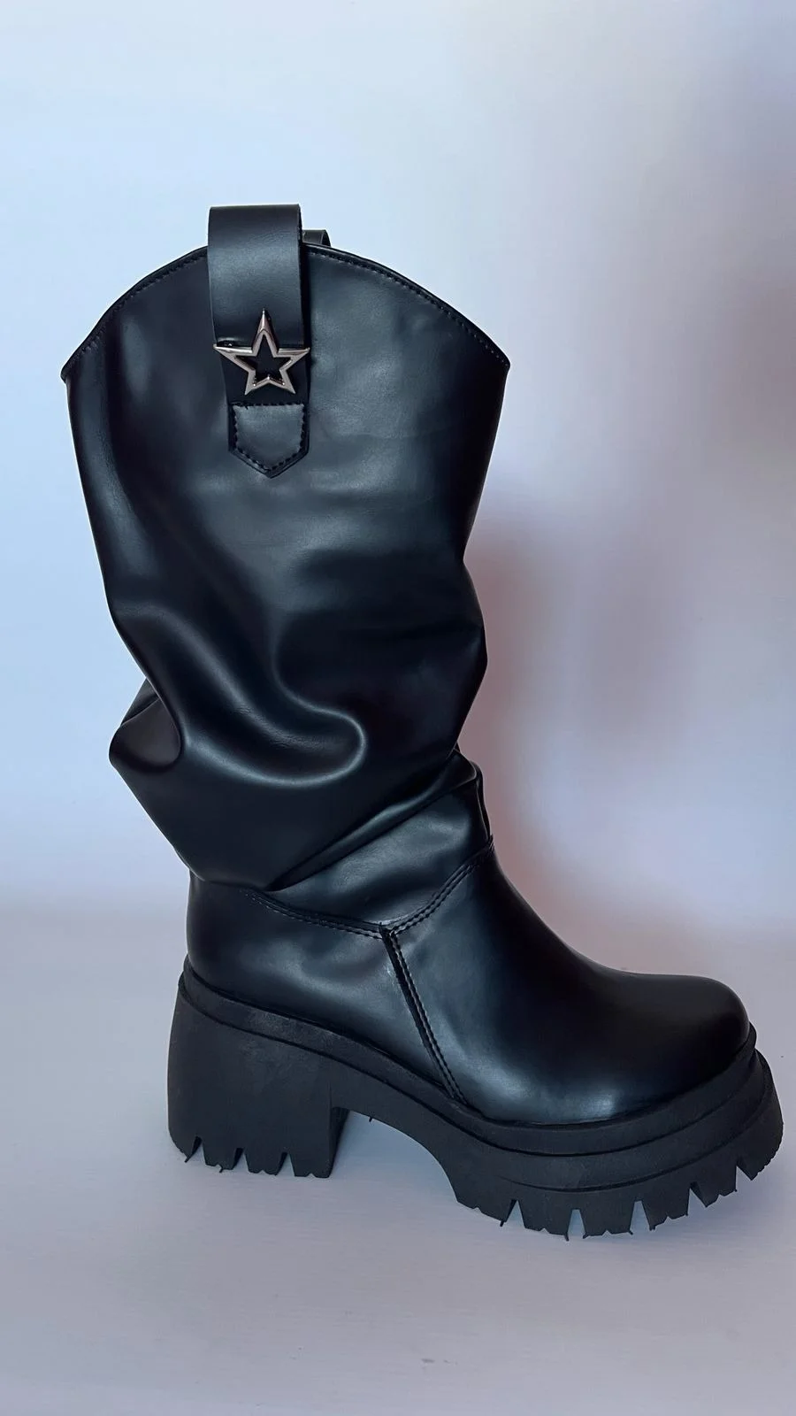 «Botas negras de caña media arrugada, con suela gruesa y aplique de estrella metálica. Cómodas, originales y con un aire western urbano que levanta cualquier look»