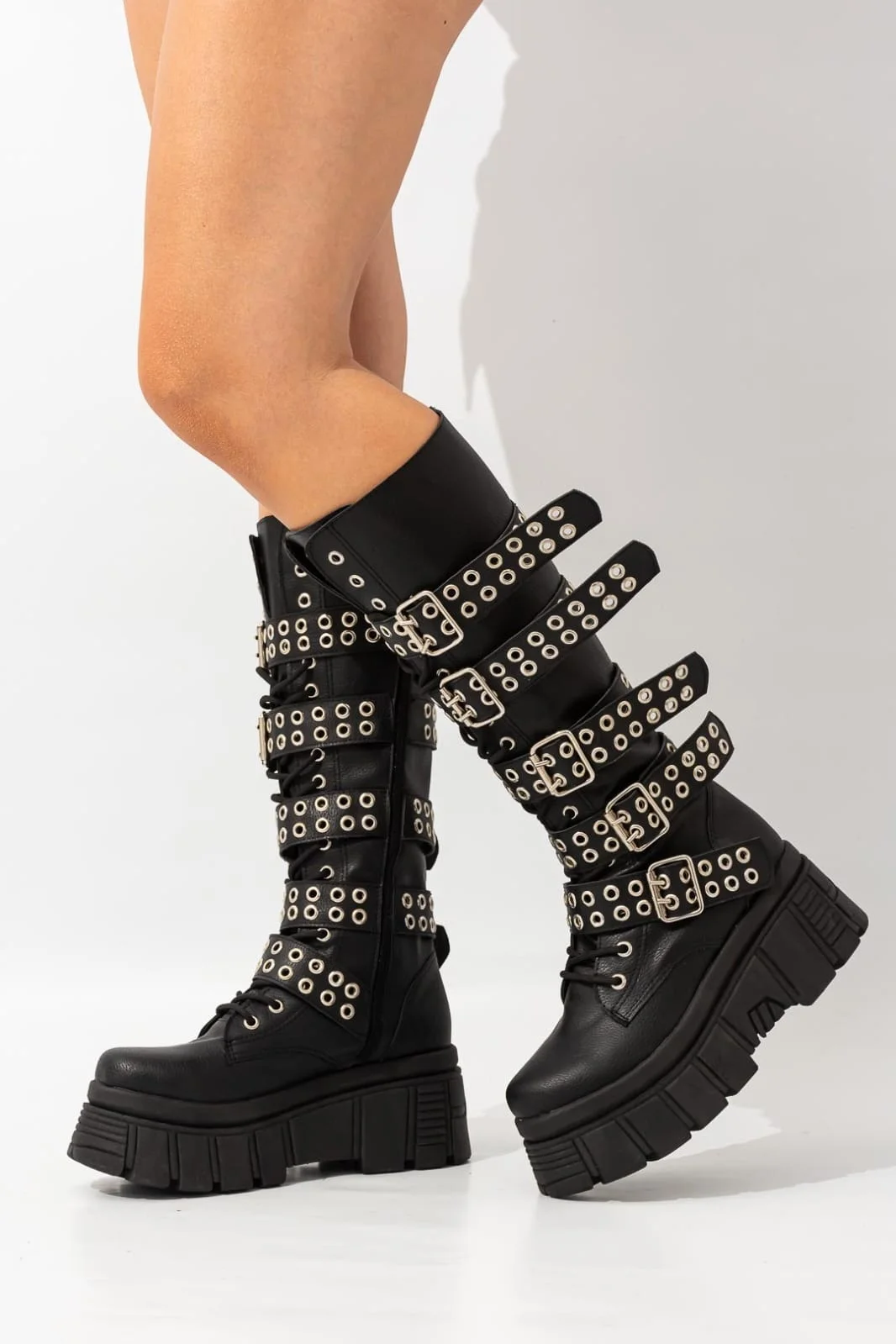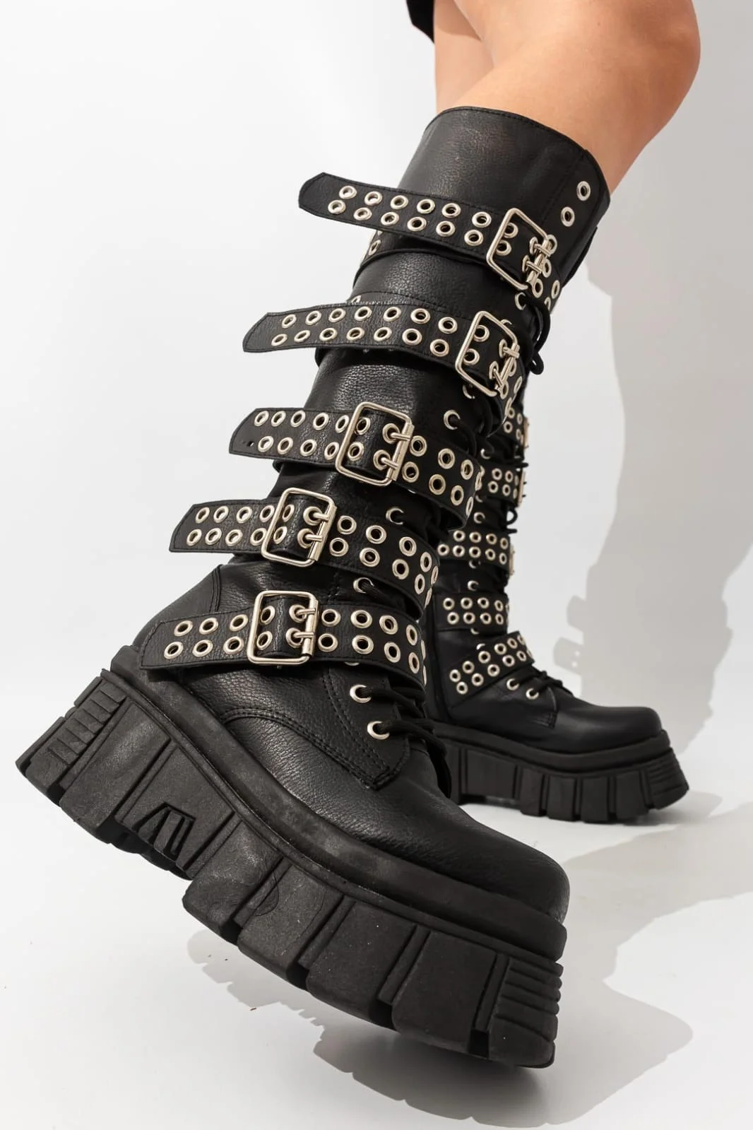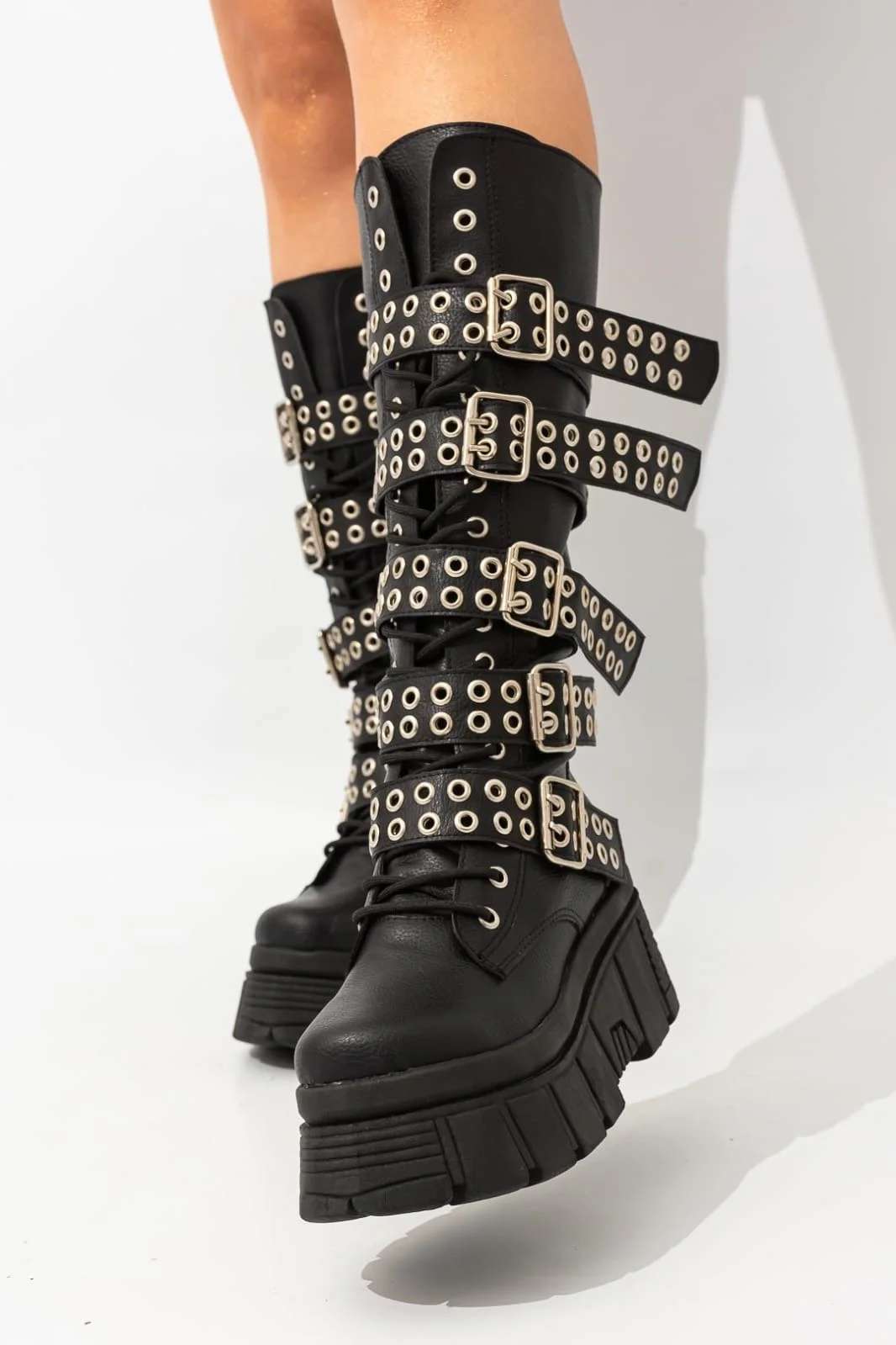 “Botas de caña alta con plataforma XL y múltiples tiras con hebillas metálicas que hacen la diferencia. Con diseño robusto y detalles llenos de actitud, son el calzado perfecto para un look audaz, urbano y con mucha fuerza.”