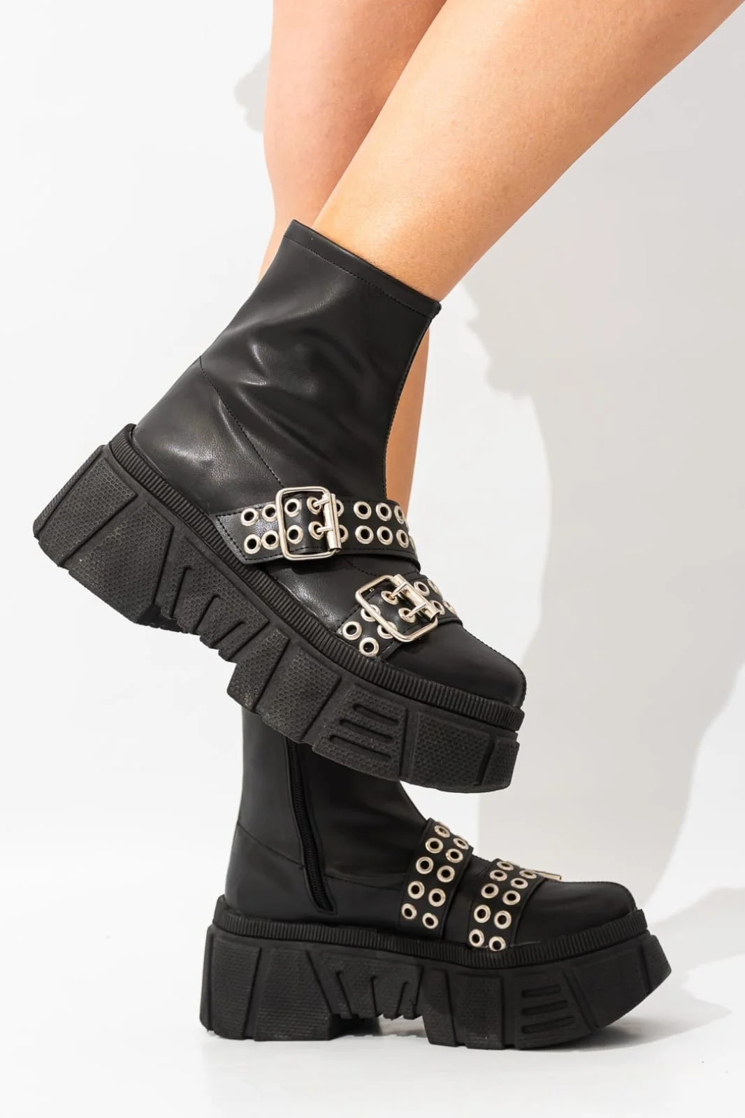«Botas negras con plataforma y doble hebilla con tachas . Un diseño urbano y rebelde que combina comodidad y estilo sin pasar desapercibido»