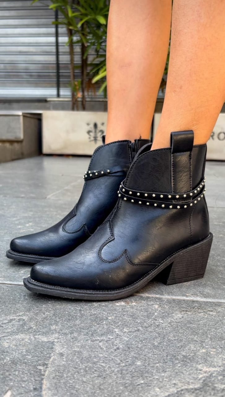 Botas de estilo texano, con una silueta clásica y un toque moderno. Estas botas de ecocuero negro combinan el estilo western con un toque moderno y chic, gracias a su tira con tachuelas plateadas alrededor del tobillo, puntera ligeramente puntiaguda y tacón bajo cuadrado, ofreciendo comodidad y versatilidad para looks casuales y con actitud.