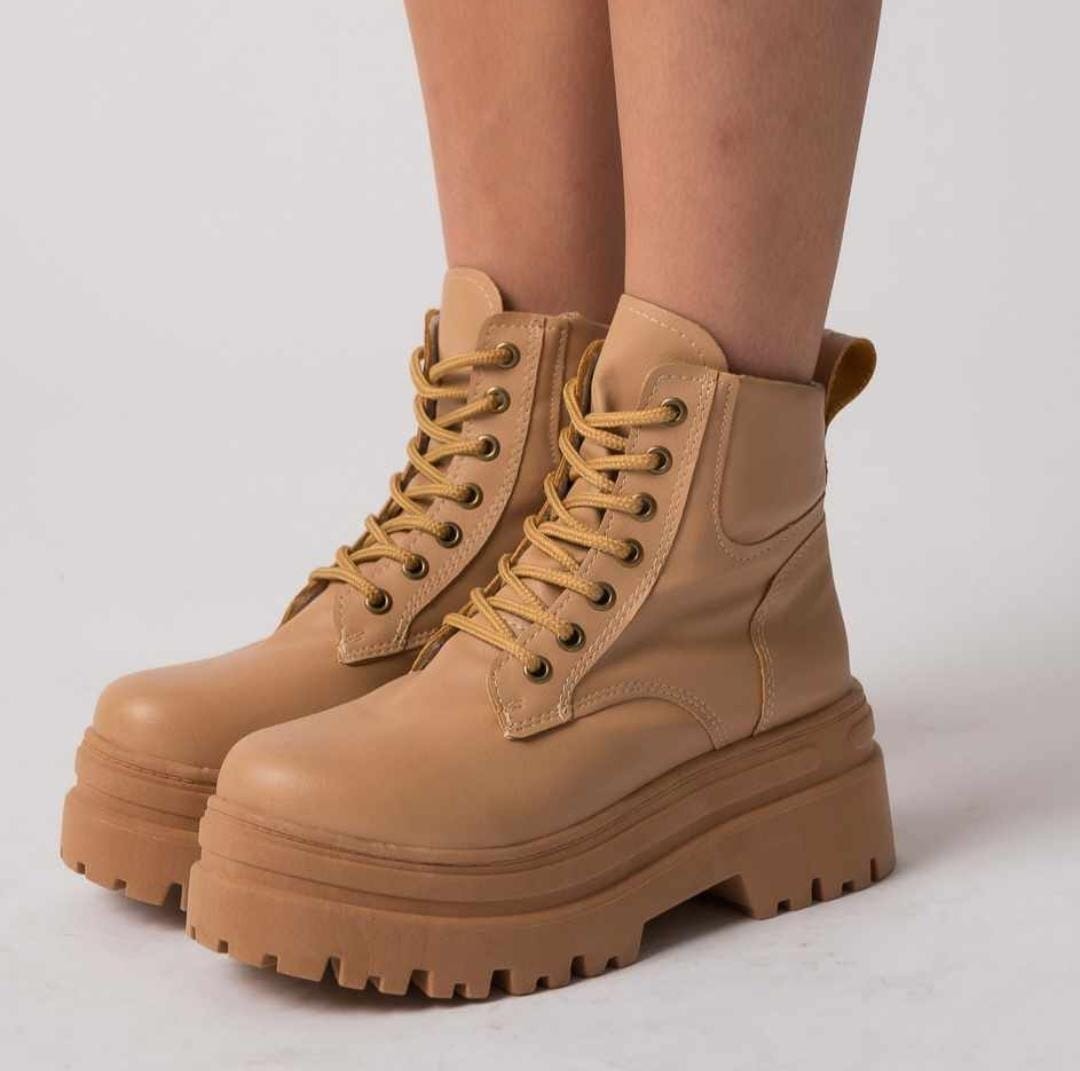 Estos borcegos son un calzado robusto y moderno, perfectos para destacar en cualquier outfit urbano. Están confeccionados en un material tipo cuero sintético de color beige claro, con una suela en tono caramelo que aporta altura y un look audaz.