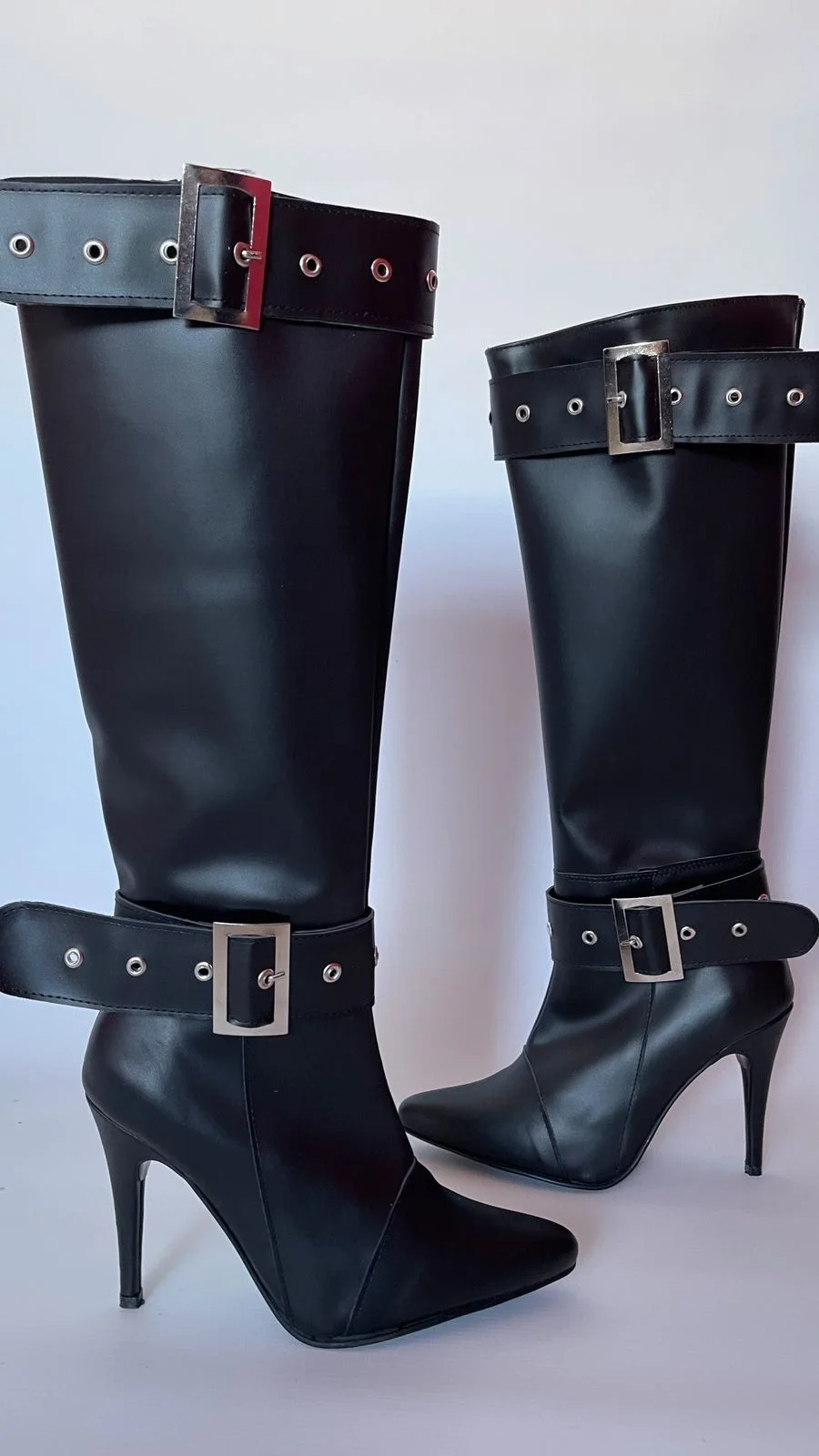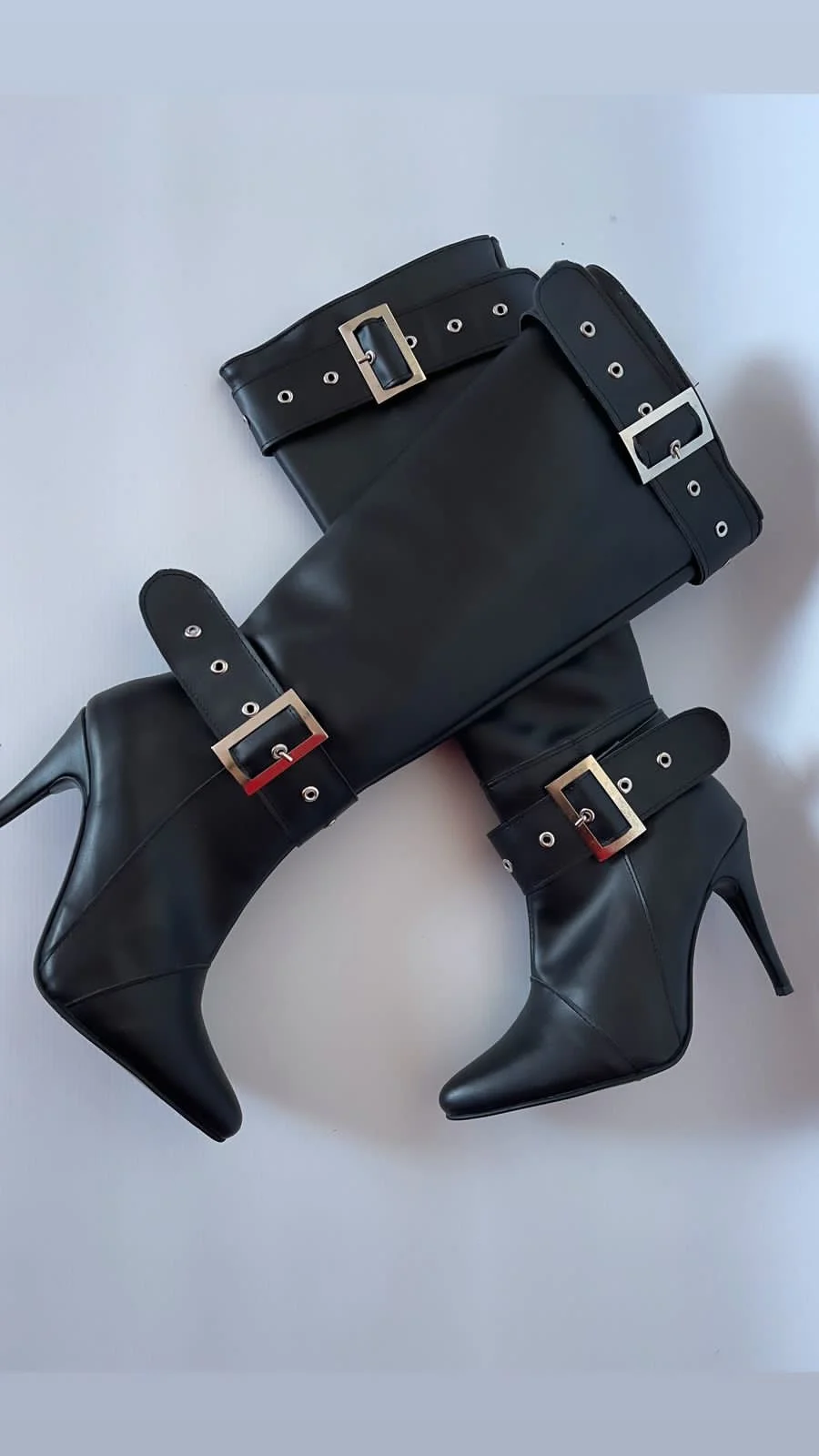«Botas negras de taco aguja con caña alta y grandes hebillas metálicas. Un diseño elegante y osado, que combina estilo sofisticado con un aire rocker»