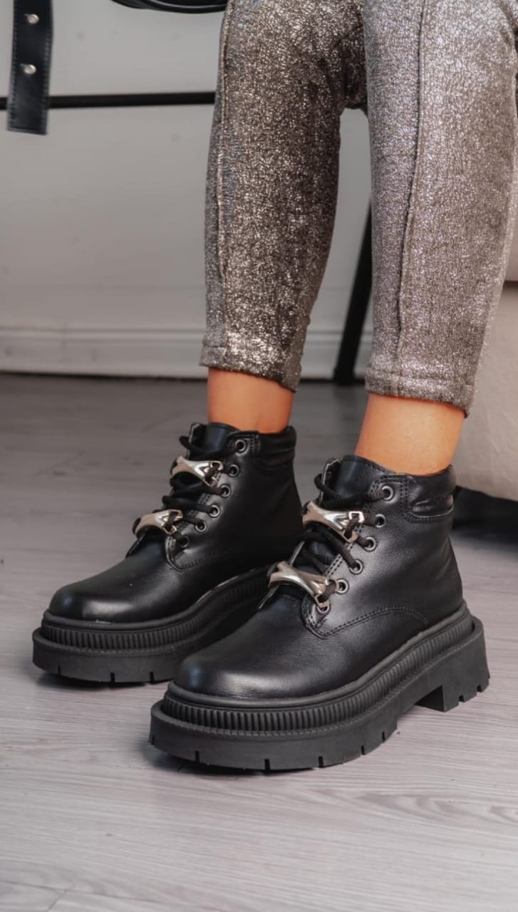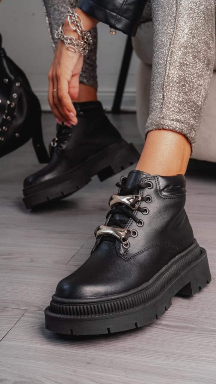 Estos Borcegos son una bomba. Tienen una onda urbana bien marcada, el cuero negro le da toda la presencia, y la suela gruesa levanta cualquier outfit que quieras combinar. Los ganchos metálicos para los cordones le suman ese toque rocker canchero que no pasa desapercibido. Ideales para patear la ciudad con estilo sin perder ni un poco de comodidad. Si las combinás con algo más jugado, como ese pantalón con brillo que se ve en la foto, ya estás lista para romperla en cualquier plan, de día o de noche.