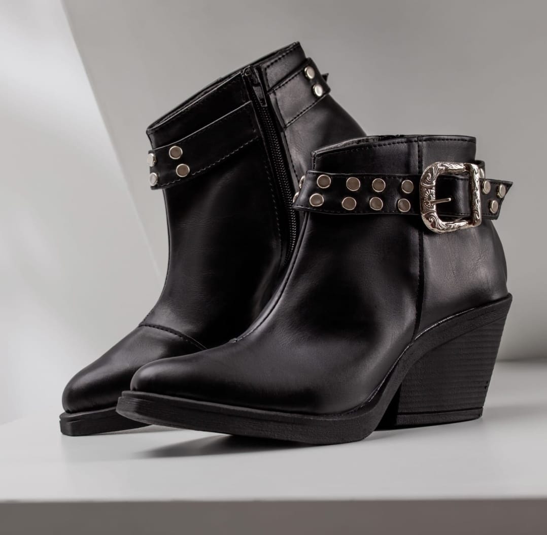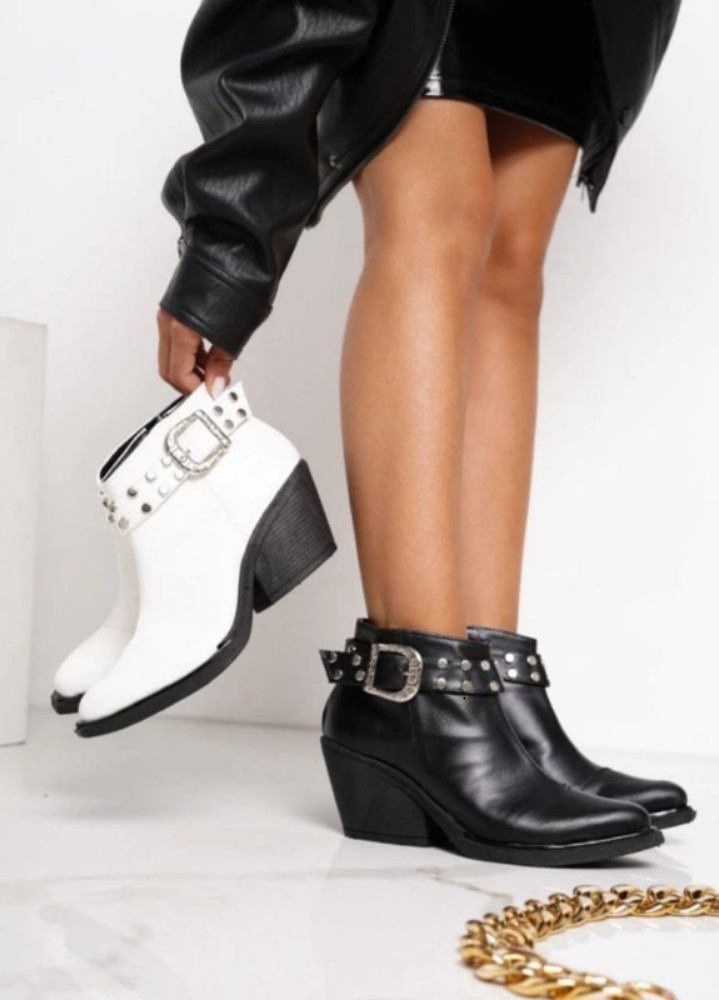 Estas botas onda texanas que son un golazo! Vienen en blanco y negro, para que elijas el que mejor va con tu onda. Tienen un taco medio que te estiliza y una hebilla con tachas que le da un toque rocker. Son perfectas para darle onda a cualquier look, desde uno tranqui hasta uno más jugado.