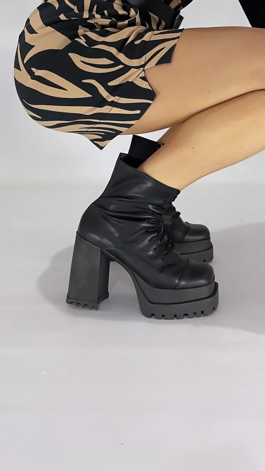 «Borcegos negros con plataforma XL y taco ancho, un diseño que impone presencia y estilo. La caña media aporta un toque rocker y versátil. Ideales para looks audaces y urbanos. Combinalos con minis, jeans o vestidos para un outfit lleno de actitud»