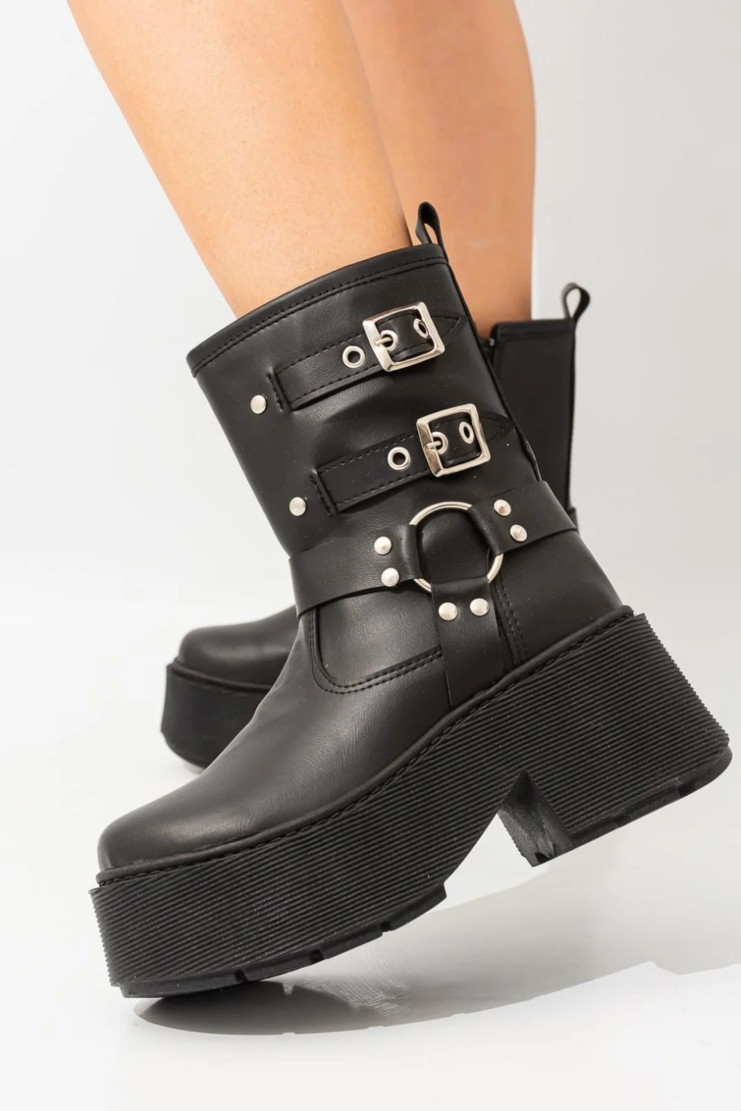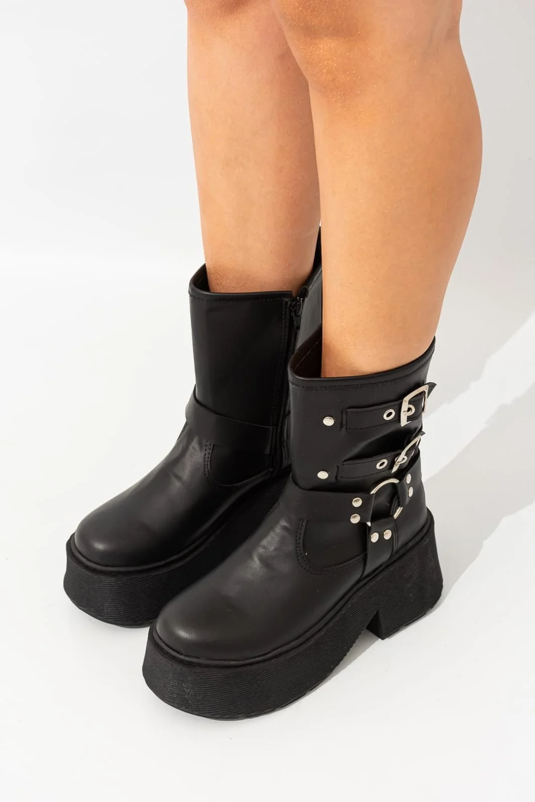«Borcegos de caña media con plataforma XL y detalles metálicos que marcan estilo. Con hebillas y apliques que refuerzan su impronta urbana, son ideales para un look canchero y con personalidad. Cómodas, modernas y fáciles de combinar.”