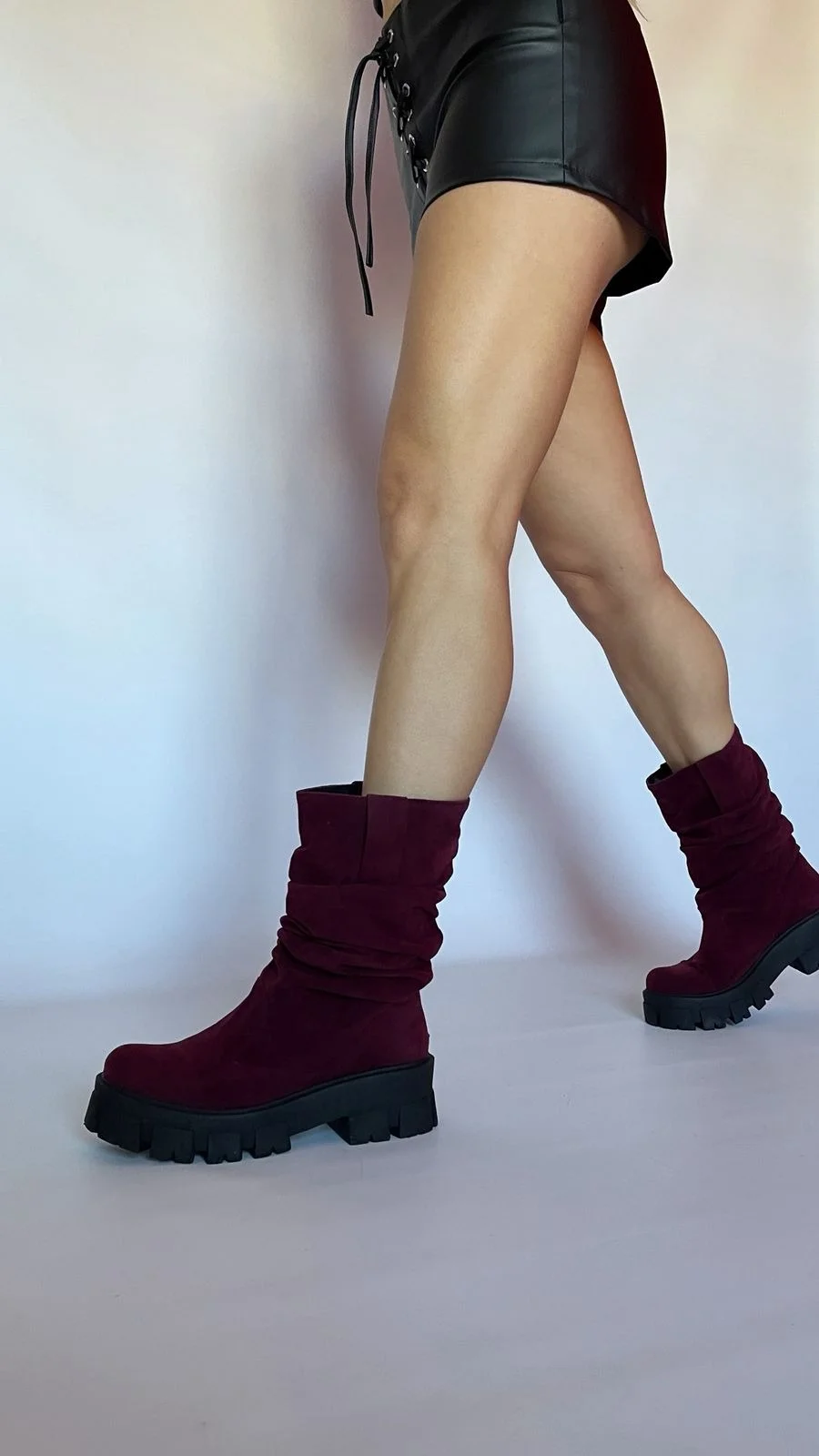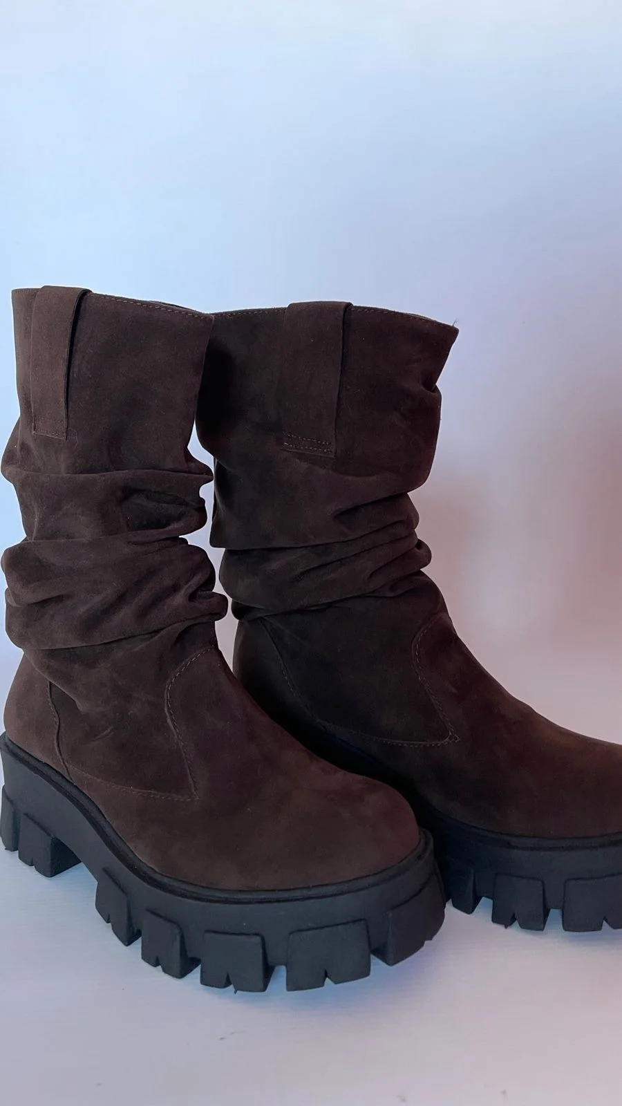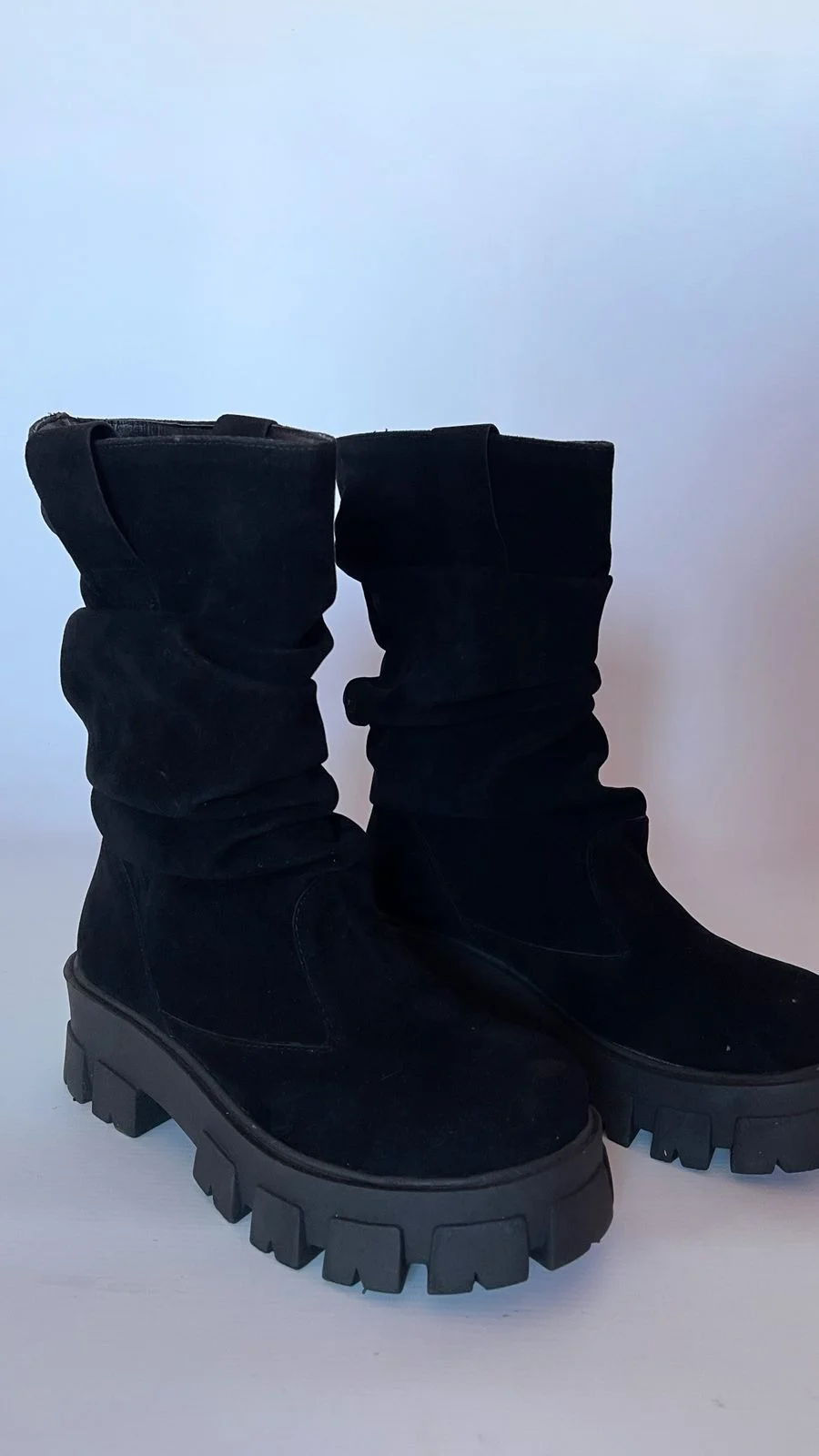 «Botas negras de gamuza con caña arrugada, suela firme y robusta. Un mix entre estilo casual y espíritu urbano, perfectas para looks relajados con carácter»