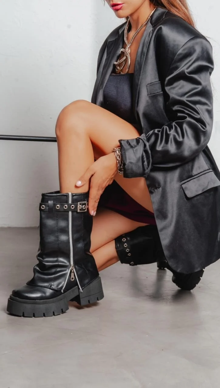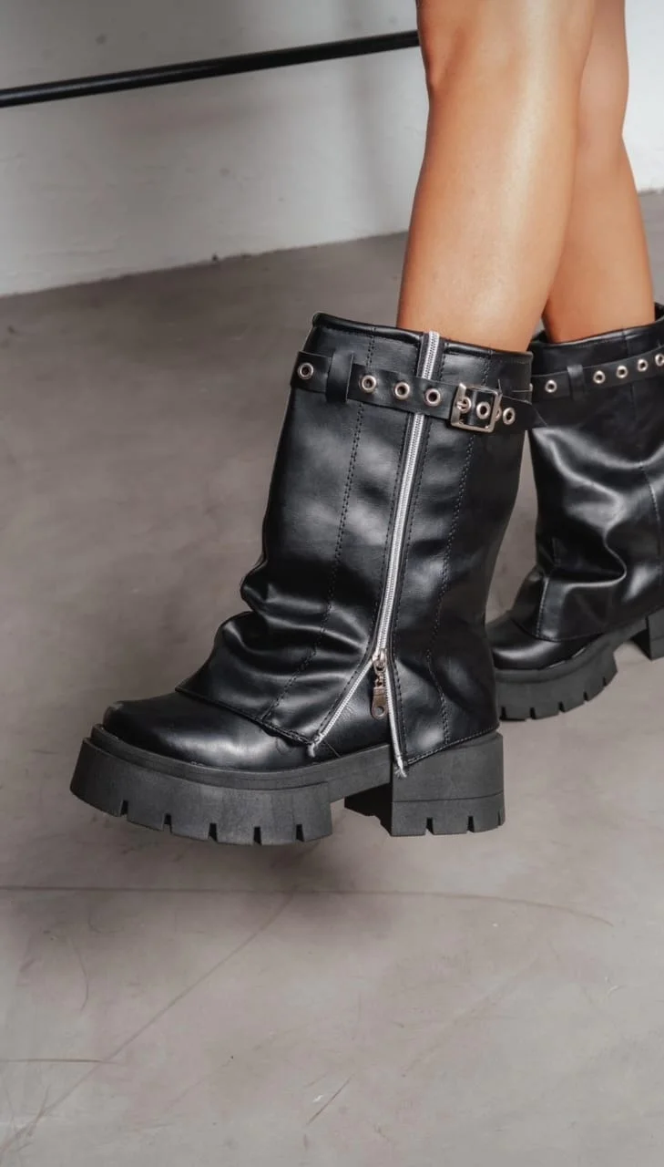 Estas botas son para las que pisan fuerte sin pedir permiso. Con caña media, base gruesa bien marcada, detalles de tachas y hebillas que hacen toda la diferencia, las Underground tienen una vibra rockera y urbana que se roba todas las miradas.
